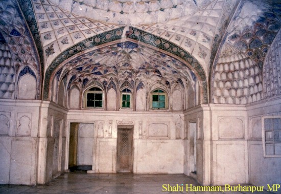 Shahi Hamam or The Royal Bath is the main attraction point at the Shahi Qila. It was specifically built for Shah Jahan's wife, Begum Mumtaz Mahal, so that she could enjoy a luxurious bath in water scented with khus, saffron and rose petals. Hamam khana was constructed during mughal period. The baths bear an inscription of khan khana Mirza Abdul Rahim Khana, the famous minister of Akbar and Jahangir. The rooms have doomed roof. Shahi hamam is beautifully decorated with paintings on honey comb work. Even today, the ceiling has many intricate paintings, including one painting which is said to have been the inspiration for the Taj Mahal. |